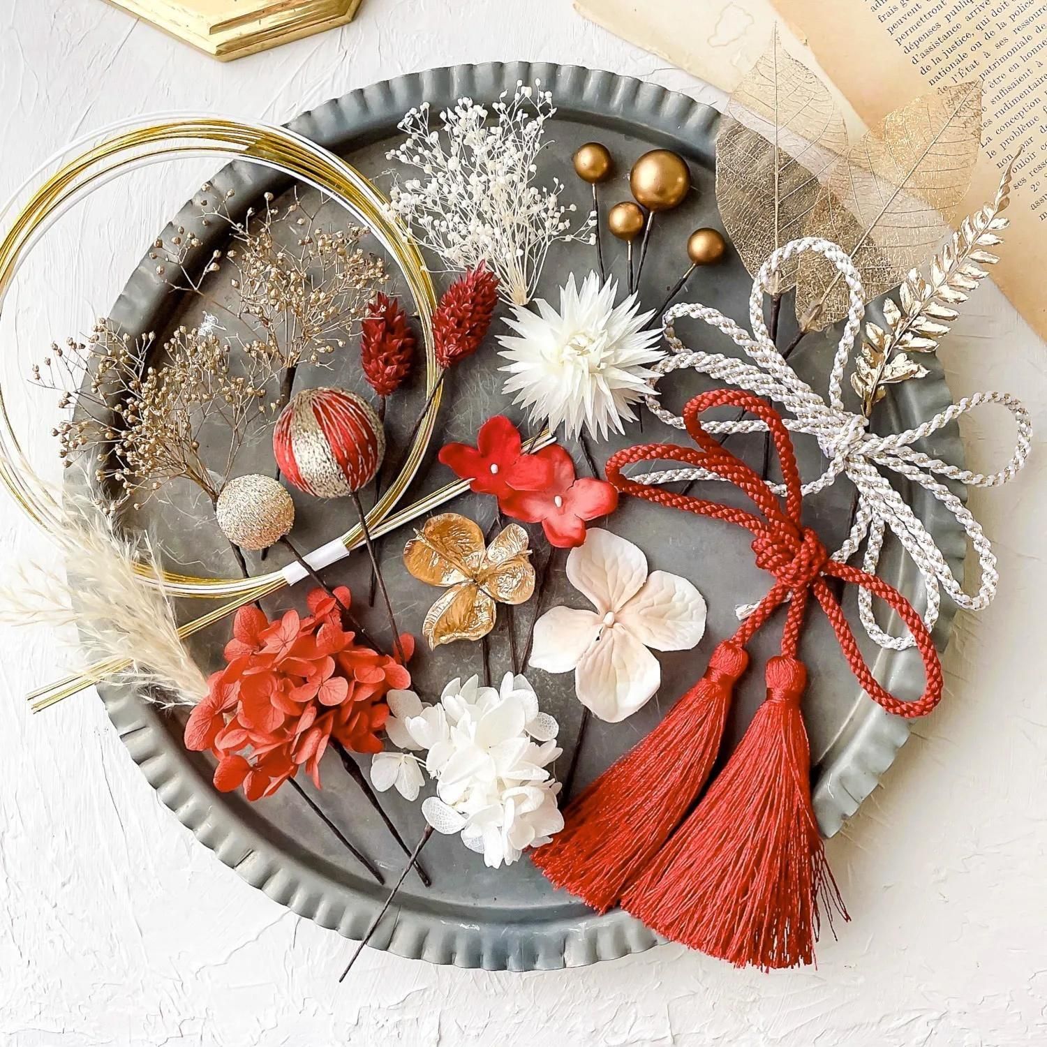 赤と白、ゴールドをメインに、和玉や房飾りを添えた華やぎのあるヘッドパーツ。
