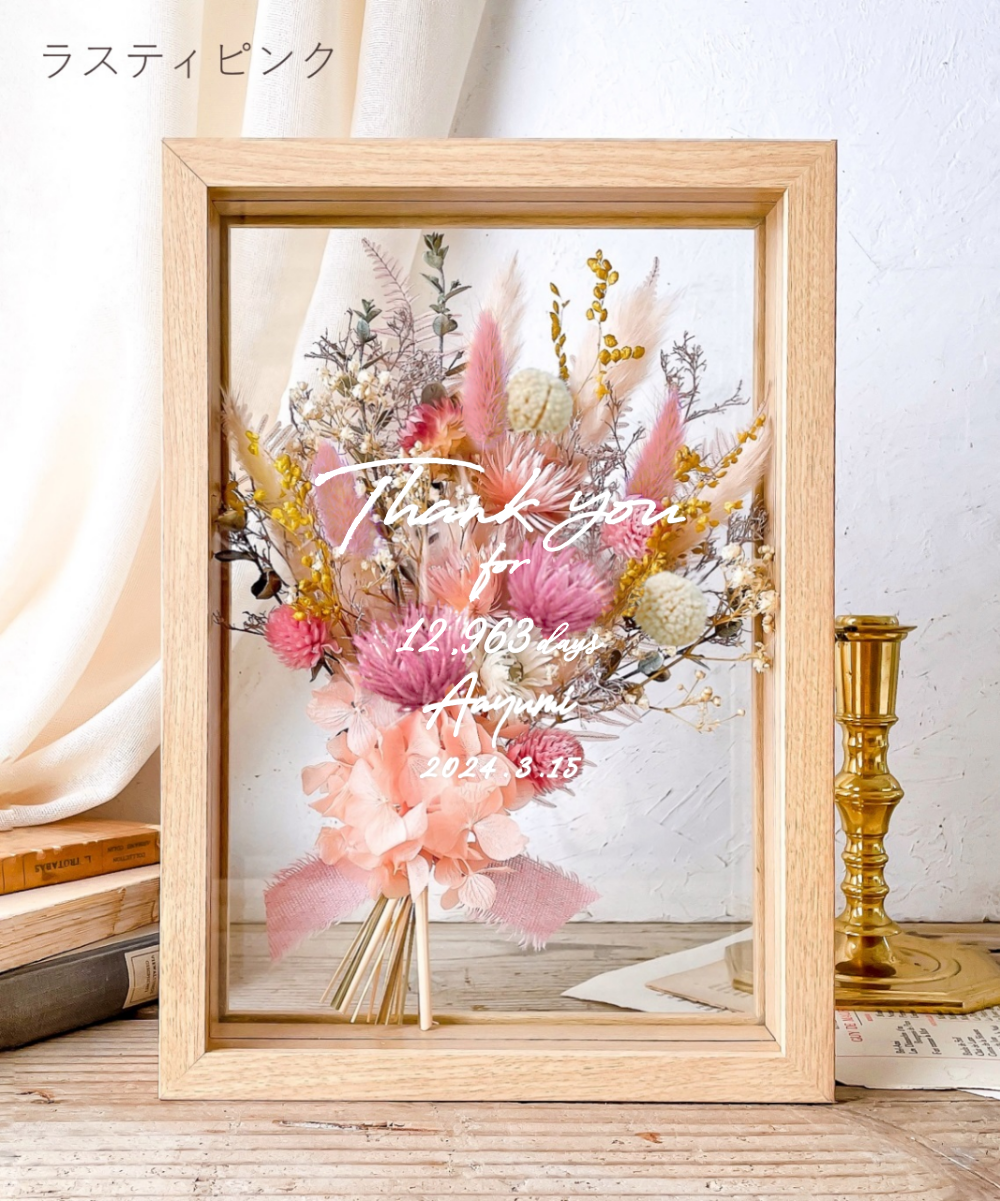 ナチュラルで華やかなブーケを両面クリアのボックスフレームにアレンジしました。