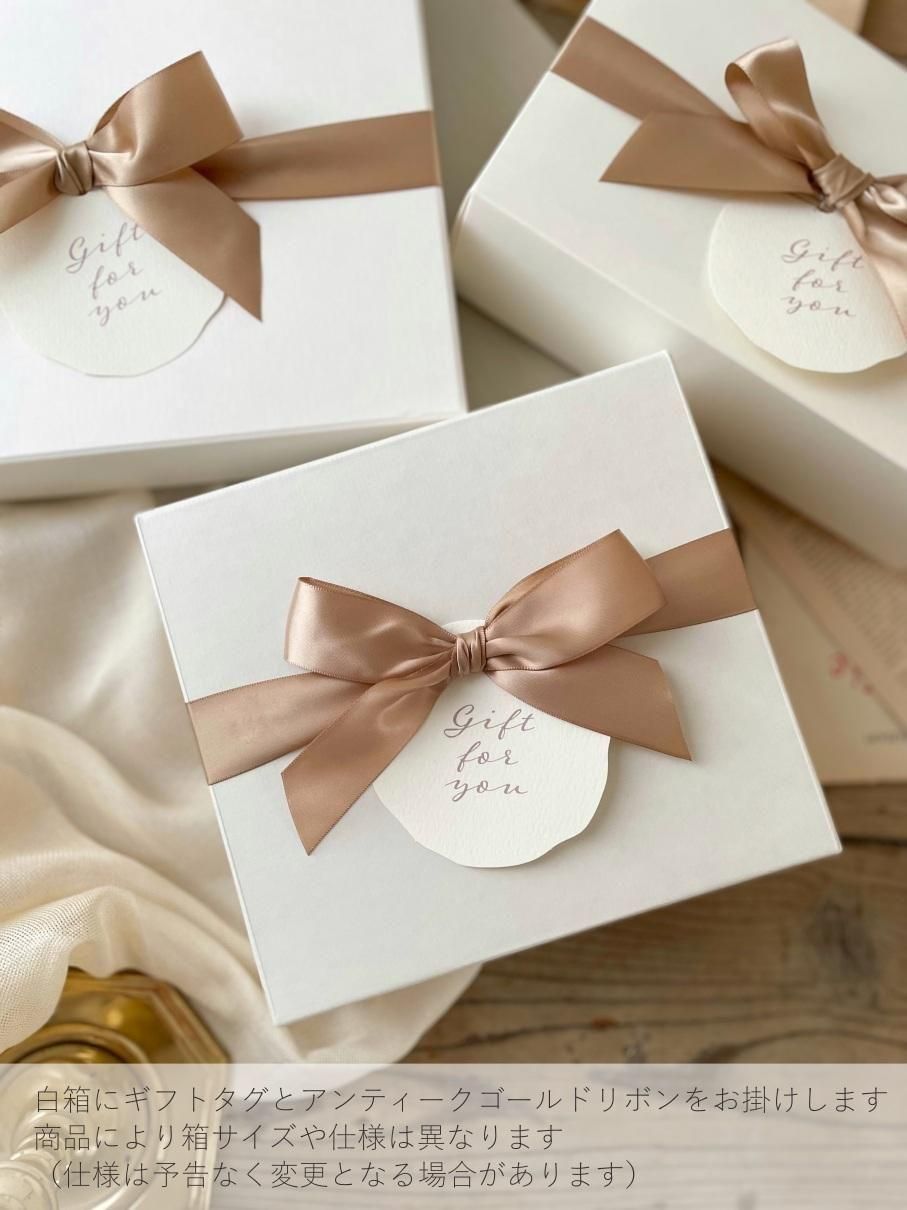 「Gift for You」のメッセージタグを添えて、白いボックスにアンティークゴールドのリボンをかけてお届けします(無料)。