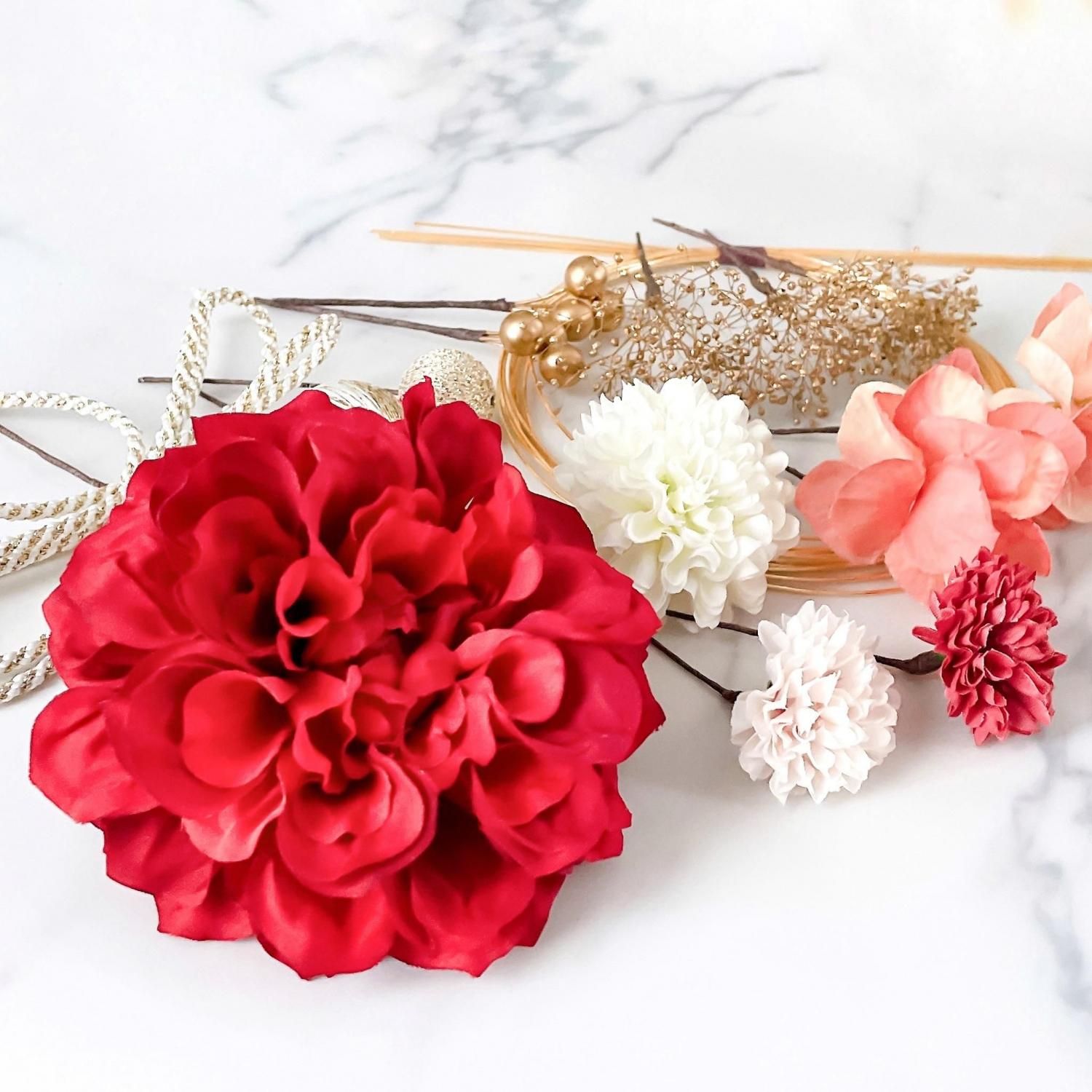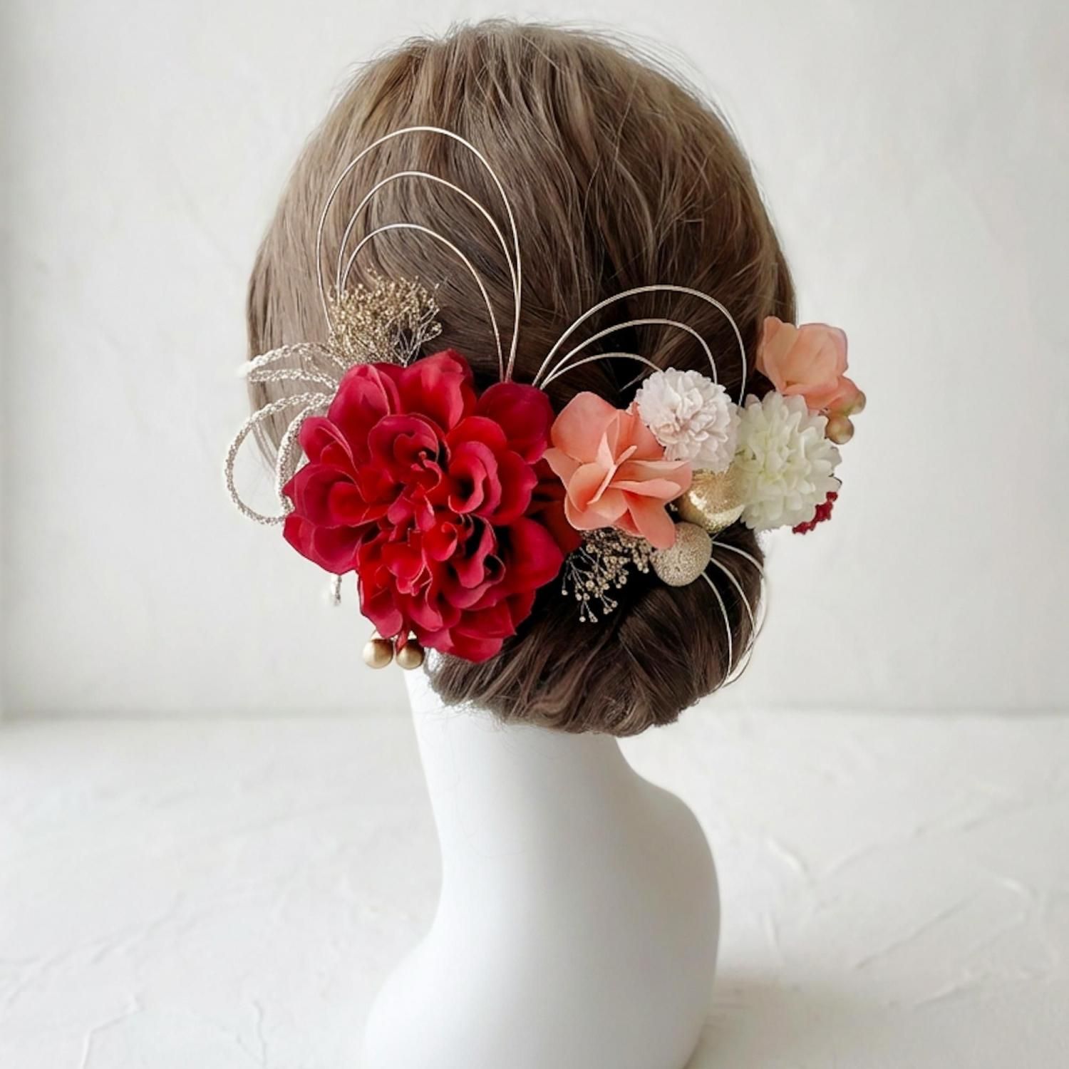 あでやかな紅白が、和の装いを華やかに引き立てる髪飾りです。