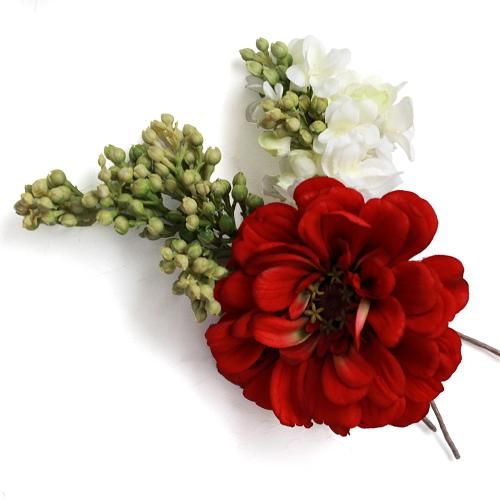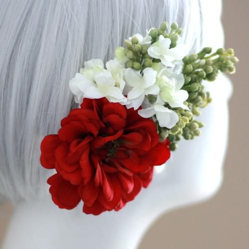 花の髪飾りは和洋兼用の髪飾りになるのも魅力のひとつ。和装髪飾りはもちろん、ドレスにもおすすめです。
